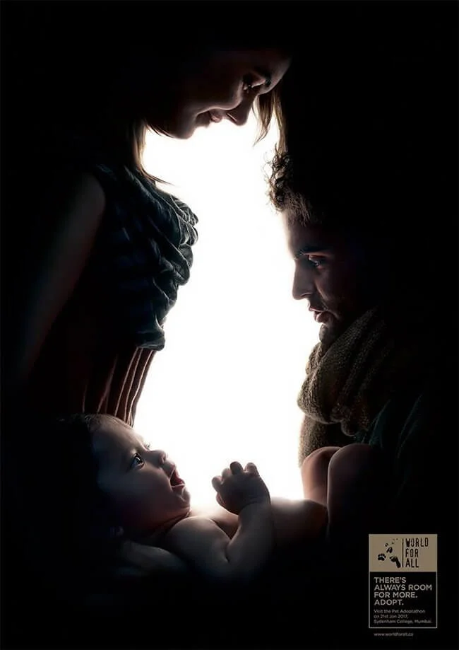 Com a intenção de promover a adoção de animais no World For All Adoptathon em Mumbai, o fotógrafo Amol Jadhav e o diretor de arte Pranav Bhide criaram uma campanha cuja ideia era retratar casais e famílias de forma que o espaço negativo entre eles formasse a silhueta de um animal doméstico.