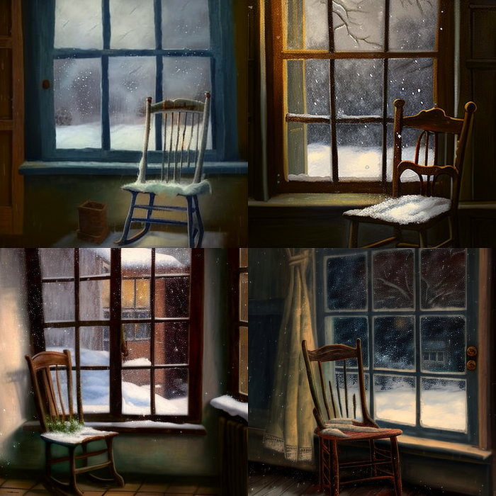 oil painting, a chair and window, it is snowing outside— v 4