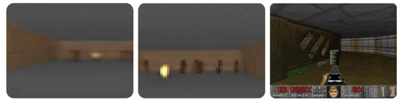 Este ano, o Google publicou um trabalho chamado GameNGen, gerando uma mudança significativa do cenário, pois o projeto foca na melhoria da qualidade das imagens com modelos de difusão, utilizados pelas principais IAs generativas de imagens (como o Dall-E, da Open AI, mesma empresa do Chat GPT), conhecidos por criar imagens tão realistas que muitas vezes são indistinguíveis das reais. A melhoria é visível a ponto de não conseguirmos diferenciar a imagem gerada por IA da imagem original do jogo ao qual a IA foi treinada. Na imagem abaixo conseguimos ver a evolução das qualidades das imagens, sendo a primeira gerada pelo World Models, a segunda pelo Game GAN e a terceira pelo Game N Gen.