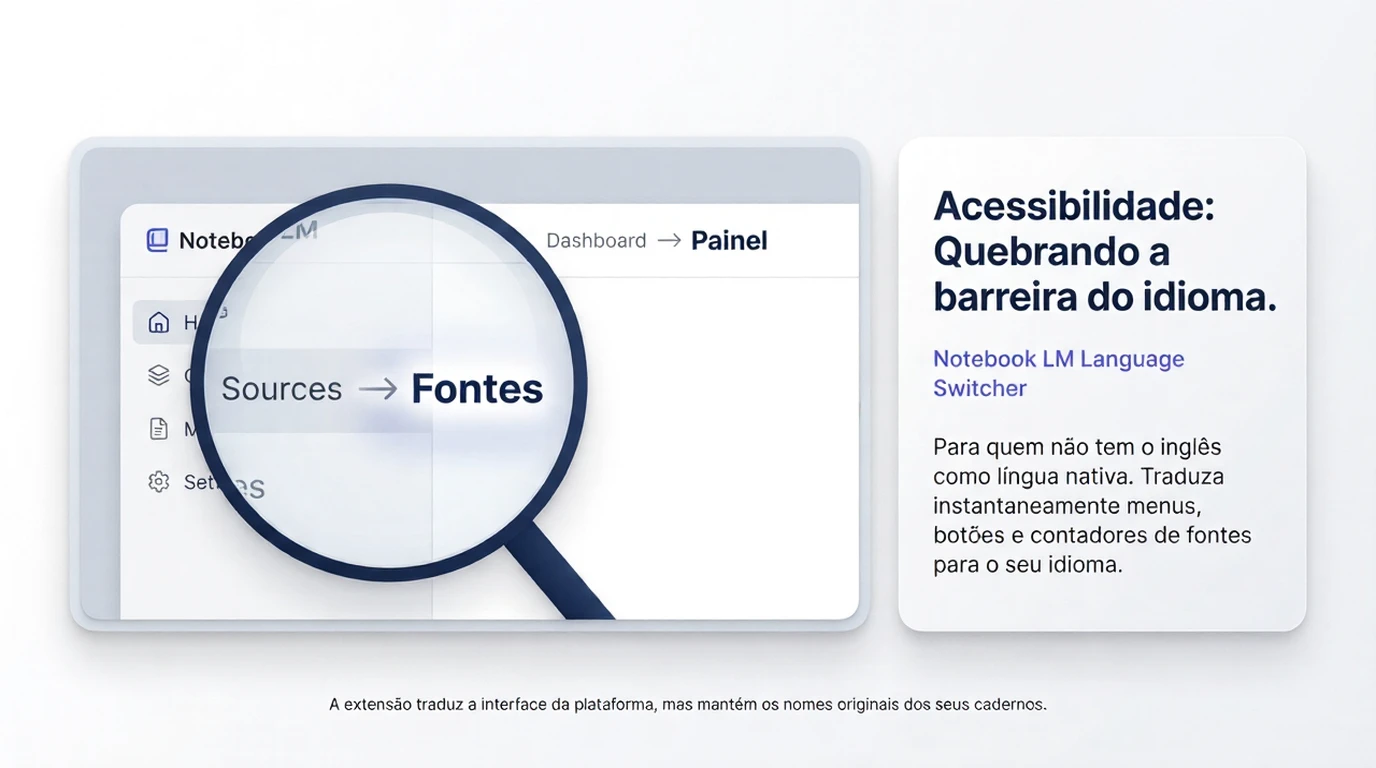 A Notebook LM Language Switcher é uma extensão extremamente útil para quem não tem o inglês como língua nativa. Ela traduz toda a interface do NotebookLM (como botões, menus do estúdio e contadores de fontes) para outros idiomas, como o alemão, por exemplo. É importante notar que ela traduz apenas a interface da plataforma, e não os nomes dos cadernos que você criou.