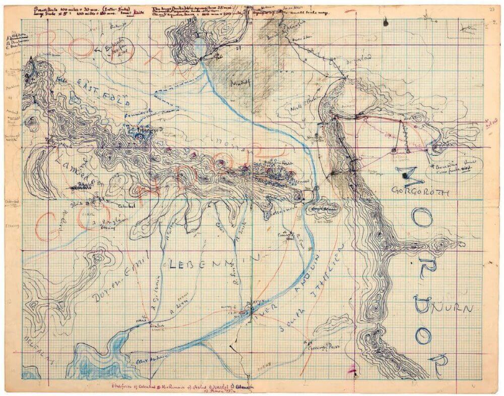 Outra característica de Tolkien que a obra revela é sua mania de revisão. Em “Earliest map of the Shire”, linhas feitas inicialmente a lápis foram cobertas com tinta azul e vermelha. Há rasuras que trocam, por exemplo, “Puddifoot” por “Maggot”, e “elfos” são adicionados com um círculo. Os mapas detalhados impressos em sua forma final do livro ajudam os leitores a se orientarem – e com certeza os rascunhos também auxiliaram Tolkien a não se perder em meio a sua própria narrativa.