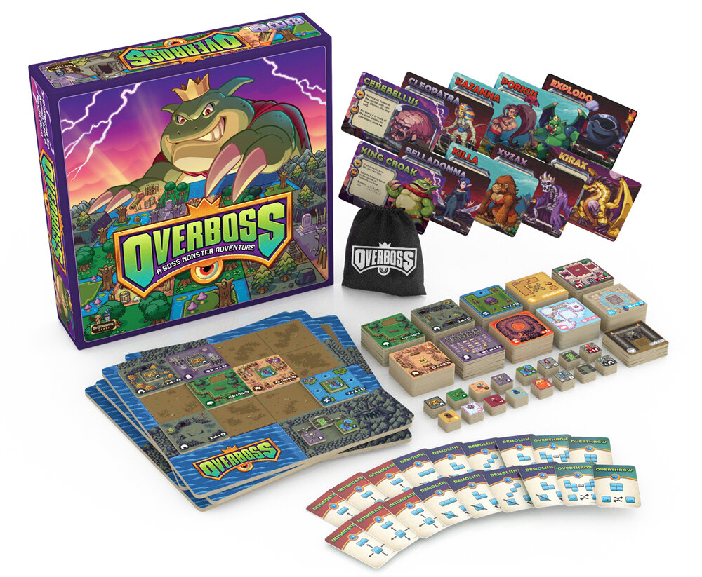 Continuação espiritual do card game Boss Monsters, Overboss resgata a bela e carismática arte pixelada do antecessor. A produção escalou vários degraus no cuidado, com imagens mais trabalhadas, ótimo insert de guardar as peças e muitas, muitas variantes. O jogo básico é bastante acessível para jogadores mais novos.