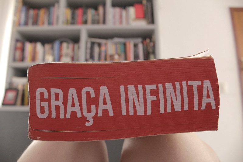 A graça da coisa acaba quando ele vê os livros se mexendo, ganhando vida. A porta do quarto é bruscamente fechada por Graça Infinita. Esperando Godot se joga em sua mão a ponto da caneca desequilibrar. O aguaceiro fervente recai na Bíblia. Os livros todos abanam suas páginas e, feito um motim, se atiram sobre ele.