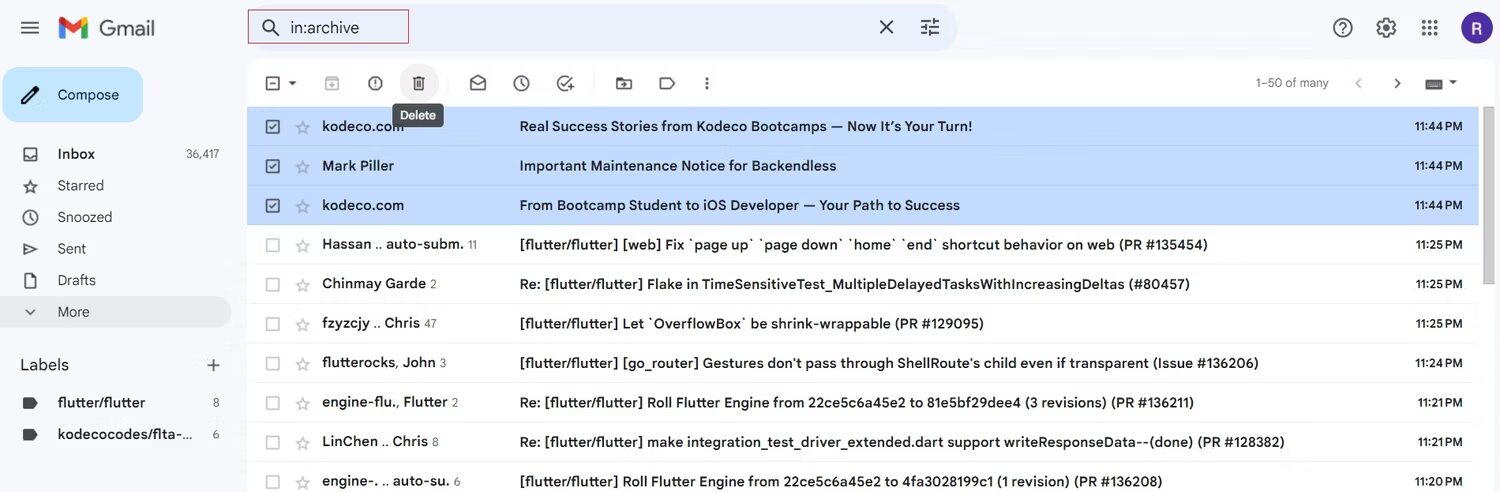 2. Alternativamente, insira in:archive na barra de pesquisa do Gmail, selecione o e-mail arquivado e clique no ícone Excluir.